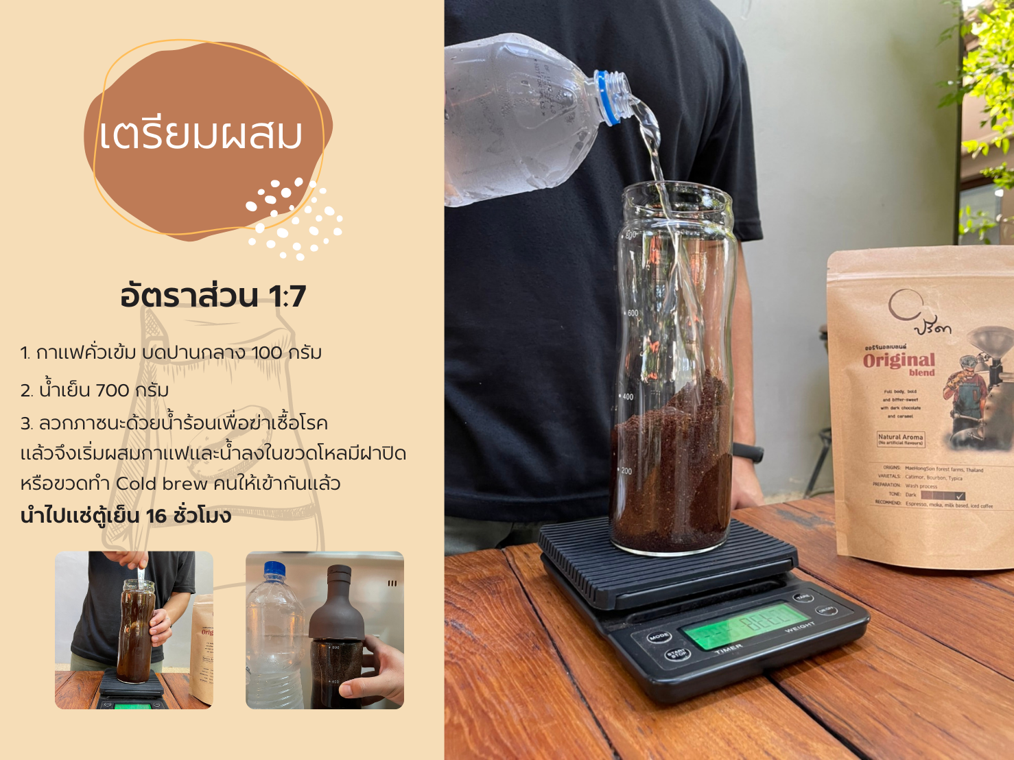 3. ลวกภาชนะด้วยน้ำร้อนเพื่อฆ่าเชื้อโรค แล้วจึงเริ่มผสมกาแฟและน้ำ ลงในขวดโหลมีฝาปิด หรือขวดทำ Cold brew คนให้เข้ากันแล้วนำไปแช่ตู้เย็น 16 ชั่วโมง (เช่น เริ่มแช่ 4 โมงเย็น นำออกมากรองตอน 8 โมงเช้า)