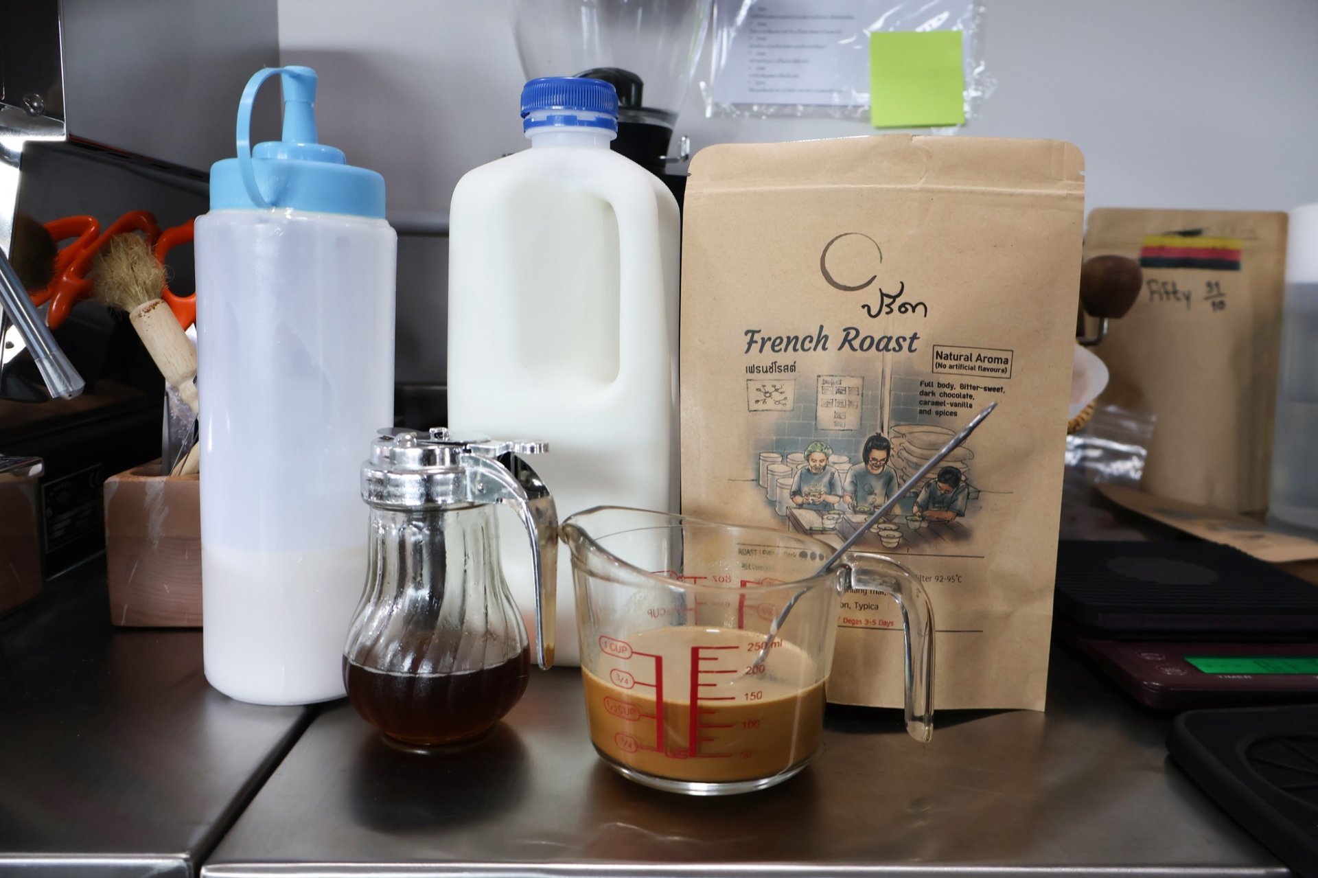 2. ผสมนมสด 60ml, นมข้นหวาน 1 ช้อนโต๊ะ และ น้ำเชื่อม 0.5 ช้อนโต๊ะ ลงในกาแฟ แล้วคนให้เข้ากัน จะได้น้ำกาแฟสีน้ำตาลทอง ส่งกลิ่นหอมๆ น่ารับประทาน