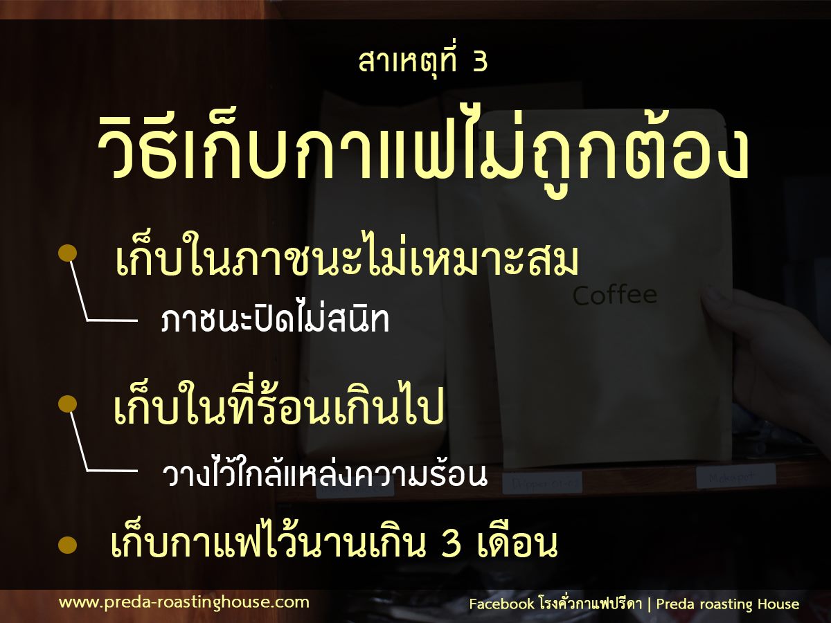 เก็บกาแฟไว้นานเกิน 3 เดือน  หากเก็บเมล็ดกาแฟไว้นานและเก็บผิดวิธี จะยิ่งส่งผลให้