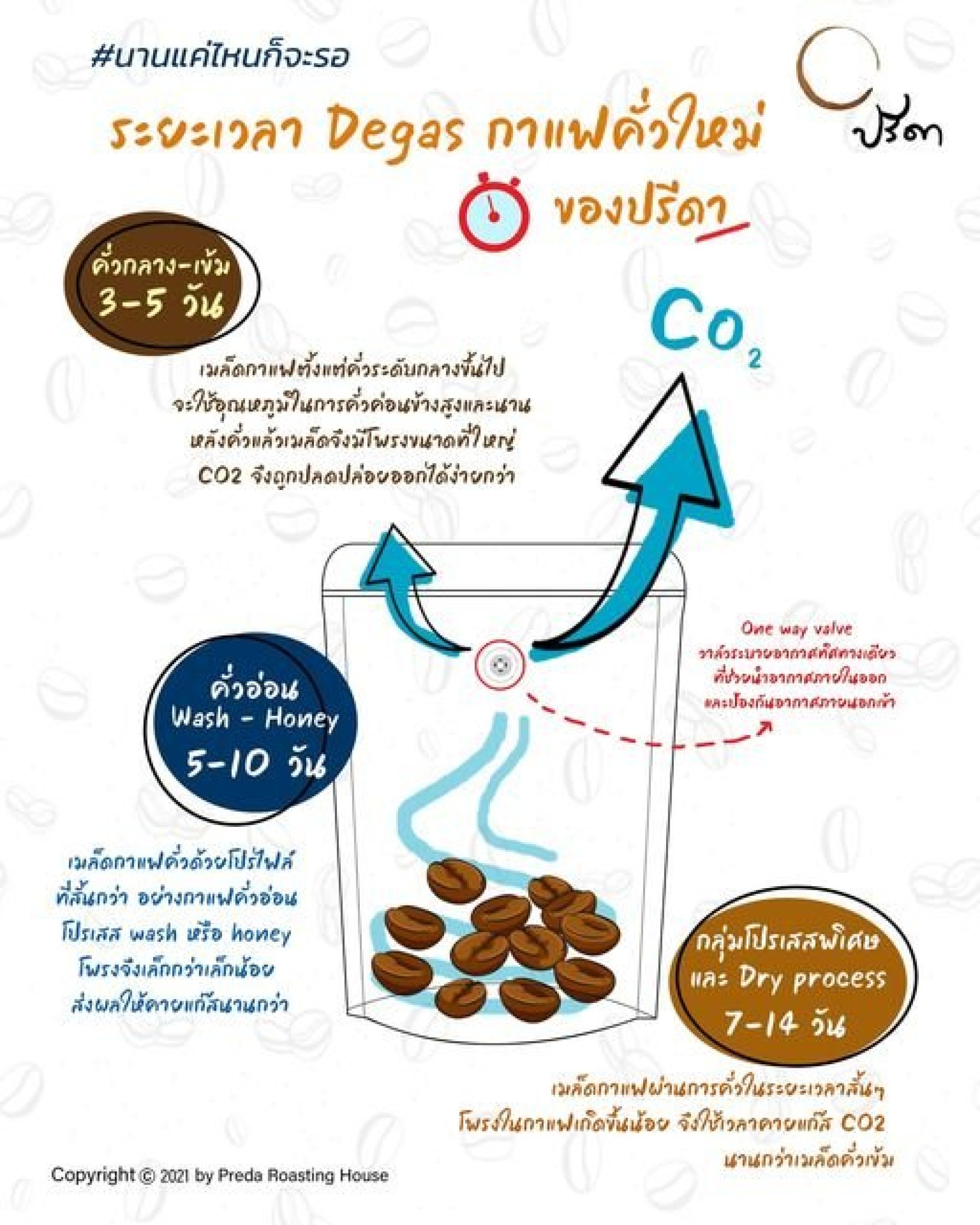 ด้านหลังถุงกาแฟของปรีดาจะมีวาล์วแบบ One-way Valve เพื่อให้กาแฟได้คายแก๊ส และได้ระบุเวลา Degas ที่เหมาะสมกับกาแฟนั้นๆไว้บนหน้าถุง