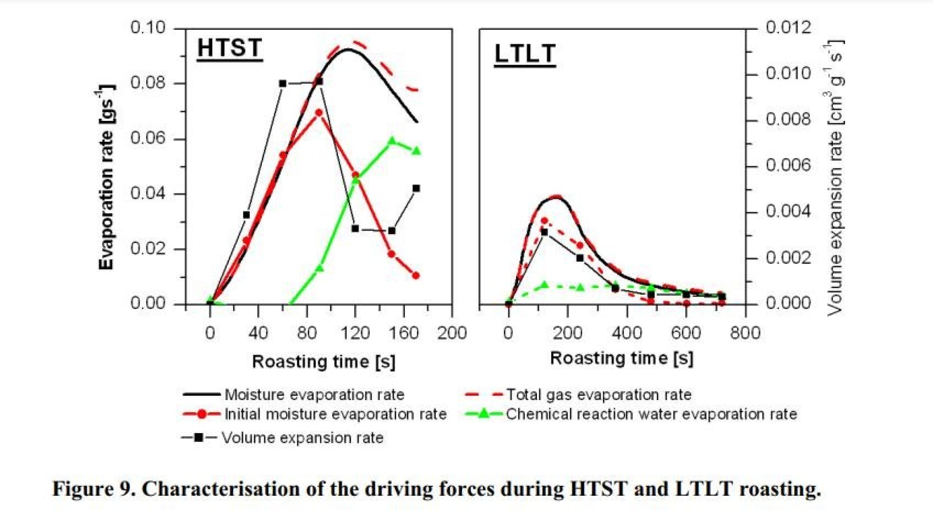 วันก่อนมีน้องนักคั่วมาถามว่าพี่คั่ว Fast หรือ Slow? แล้วอย่างไหนมันดีกว่ากัน? ไอ้ผมก็สงสัยว่าแค่ไหนเรียก fast แค่ไหนเรียก slow? เพราะสมัยก่อนที่เขาคั่วกันเนี่ย fast กับ slow นี่มันต่างกันชัดเจนมากอยู่นะ อย่างเครื่องคั่ว Drum Roaster ก็นับเป็น LTLT (Low TempLong Time ) คือใช้เวลาคั่วรวมประมาณ 9 นาทีขึ้นไป แต่ถ้าเครื่องคั่วแบบ Fluidized Bed ซึ่งใช้ลมความเร็วสูงและร้อนมากก็จะนับเป็น HTST (High Temp Short Time) แบบนี้ใช้เวลาสั้นแบบ Fast X คือประมาณ 2-3 นาทีก็เสร็จละ ใครเคยใช้เครื่องคั่วป๊อปคอร์นก็คงจะพอนึกภาพออกนะครับ ซึ่งหากเราเอาสองชนิดนี้มาเทียบกัน HTST ก็เป็น fast roast ส่วน LTLT ก็เป็น slow roast ที่น้องนักคั่วถามเรื่อง Fast / Slow นั้นที่จริงเขาต้องการสื่อถึงการทำโปรไฟล์ในเครื่อง Drum Roaster ที่นิยมใช้กันทั่วไปนี่เองแหละซึ่งโปรไฟล์ก็คงต่างกัน 2-3 นาทีเท่านั้น แต่ผมนึกอยากเล่าเปรียบเทียบการคั่ว 2 แบบที่ต่างกันมากๆที่มีใช้ในอุตสาหกรรมกาแฟทั้งคู่นี้เสียก่อน เพราะมันอาจทำให้เราได้แนวไอเดียไปปรับใช้ในการคั่ว Drum ของตัวเองก็ได้ ถ้า Apply เป็น ---- เครื่องคั่วที่ใช้กันอยู่ในอุตสาหกรรมกาแฟนั้นมีอยู่ 2 แบบใหญ่ๆคือเครื่องคั่วที่ใช้เวลาคั่วสั้นและแบบคั่วนาน 1. LTLT (Low Temp Long Time) ซึ่งใช้อุณหภูมิในการคั่วประมาณ 220 C เวลาในการคั่วประมาณ 9-20 นาที ซึ่งก็หมายถึง Drum Roaster แบบที่เราคุ้นกันดีอยู่แล้ว ซึ่งตรงนี้ผมยังไม่ขอเล่ามาก 2. HTST (High Temp Short Time) ใช้ลมร้อนที่มีความเร็วสูงและอุณหภูมิสูงประมาณ 260 C หรือมากกว่า โดยอาศัยการใช้ความเร็วลมวิ่งเข้าจากทางด้านล่างขึ้นสู่ด้านบนของห้องคั่ว เมล็ดกาแฟจึงถูกยกลอยและกลิ้งอยู่กลางลมร้อน ซึ่งในสภาวะเช่นนั้นค่า สัมประสิทธิ์การถ่ายเทความร้อน (Convection Heat Transfer Coefficient, h) จะมีค่าสูง หมายถึงมีความสามารถในการถ่ายเทความร้อนจากลมสู่เมล็ดได้ดีหรือเร็วมากๆ ทำให้เมล็ดสุกเร็วได้ในเวลาสั้นแค่ 2-4 นาที การถ่ายเทความร้อน = hA (Tair-Tbean) [A=พื้นที่ผิวของเมล็ด] หลักการลมร้อนความเร็วสูงแบบนี้เรียกว่า Fluidized Bed เหมือนเครื่องคั่วป๊อปคอร์นครับแต่ในอุตสาหกรรมจริงนี่เขาทำเครื่องใหญ่ๆกันเลยนะ ทำให้สามารถคั่วได้ปริมาณมากๆทำ production ได้เยอะเลย --- เปรียบเทียบข้อดีข้อเสียของ LTLT กับ HTST 1. การขยายขนาด : การคั่ว HTST ทำให้เมล็ดขยายขนาดได้มากกว่า LTLT เนื่องจากมีความดันแก๊สเกิดขึ้นในระดับที่สูงกว่า ซึ่งเจ้าความดันที่ว่านี้ก็เป็นแรงขับที่ทำให้เกิดการขยายขนาดของเมล็ด (driving force for expansion) โดยเฉพาะในระหว่างที่ยังมีความชื้นอยู่ในเมล็ดระดับหนึ่ง เมล็ดที่ร้อนแต่มีความชื้นมากกว่าจะมีสถานะเป็น rubber หรือคล้ายยางที่ยืดตัวได้ง่ายการขยายขนาดจะเกิดได้ดีในช่วงนี้ (ซึ่ง HTST ที่ต