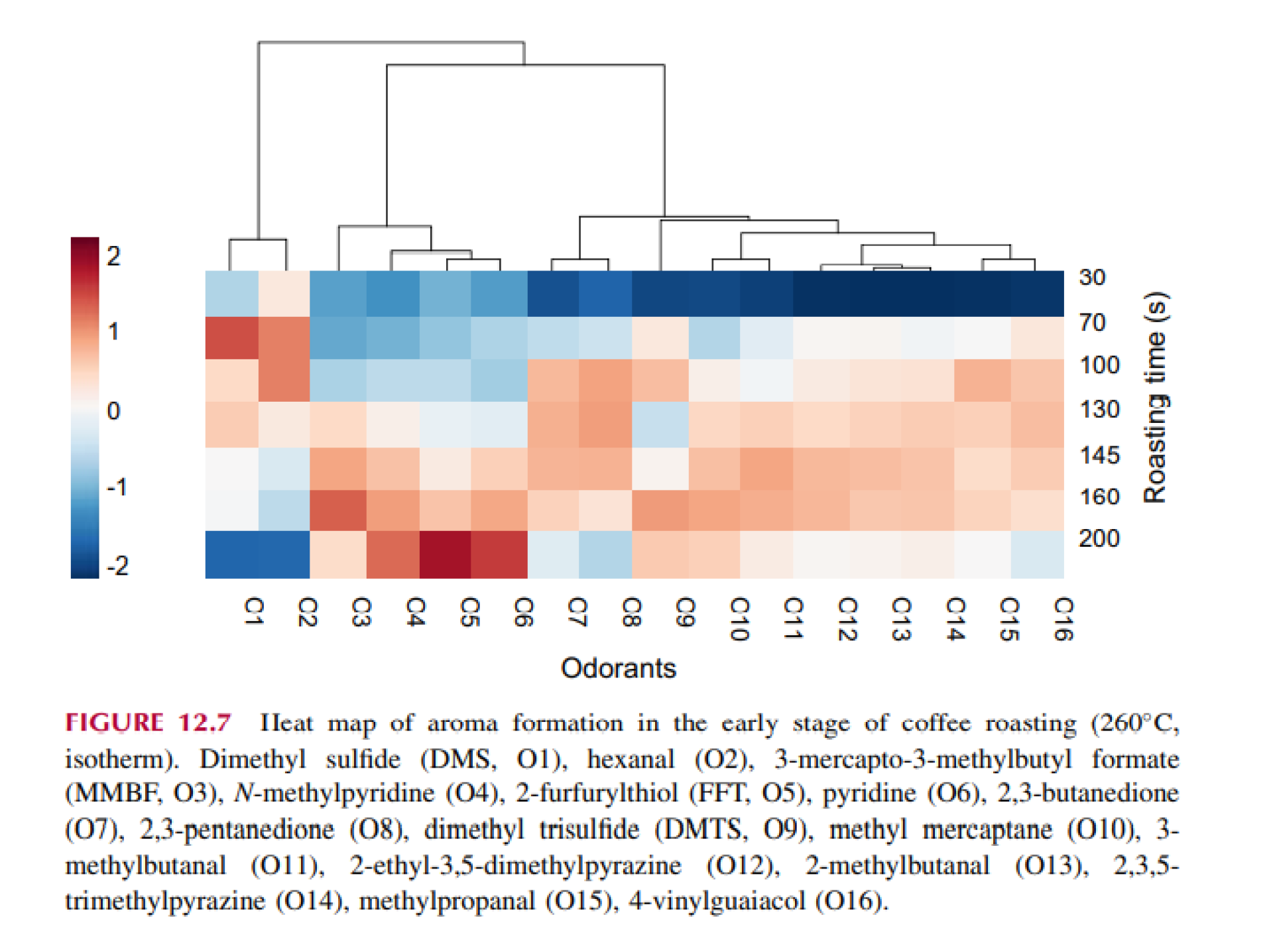 มีงานวิจัยที่เขาเก็บข้อมูลดูการพัฒนาเปลี่ยนแปลงของสารให้กลิ่นต่างๆระหว่างคั่วแล้วแสดงข้อมูลออกมาในรูป heat map คือใช้สีแสดงปริมาณของกลิ่นตัวนั้นๆ ถ้าสีโทนน้ำเงินเข้มแปลว่าแทบไม่มีสารให้กลิ่นตัวนั้นอยู่เลย แต่ถ้าเป็นสีโทนชมพูไล่เรียงถึงสีส้มก็แปลว่ามีกลิ่นตัวนั้นค่อนข้างมาก หรือ ถ้าสีแดงก็แปลว่ามีกลิ่นอยู่มากๆ การแสดงค่าเป็นแบบ heat map นี้เป็น Data Visualization ที่กำลังนิยม คนที่อยู่สายงาน digital marketing ก็คงน่าจะคุ้นกันดี สำหรับกราฟตัวที่ยกมาพูดถึงนี้ผมได้มาจากหนังสือ The Craft and Science of Coffee ของคุณ Britta Folmer นะครับ