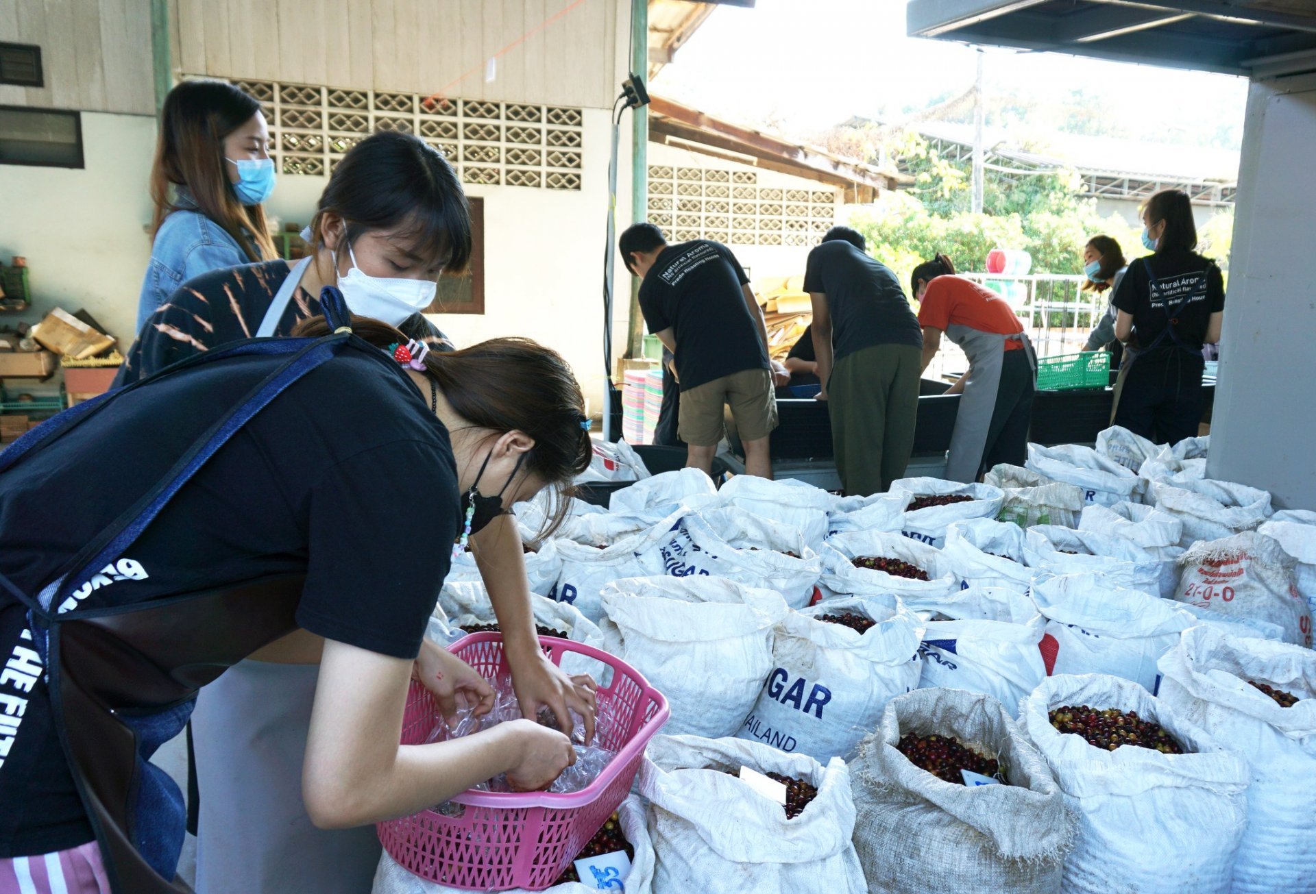 -ตรวจสอบสภาพเชอรี่ว่าเก็บมาเป็นยังไงบ้าง กาแฟเฟอร์เม้นท์มาจากในกระสอบหรือไม่? พี่นก พี่ปุ๊ก อาจจะล้วงมือลงไปด้านในเพื่อสัมผัสอุณหภูมิในนั้นด้วยว่าเป็นยังไง กาแฟที่เฟอร์เม้นท์มากแล้วมักจะให้ความรู้สึกร้อนกว่าปกติ