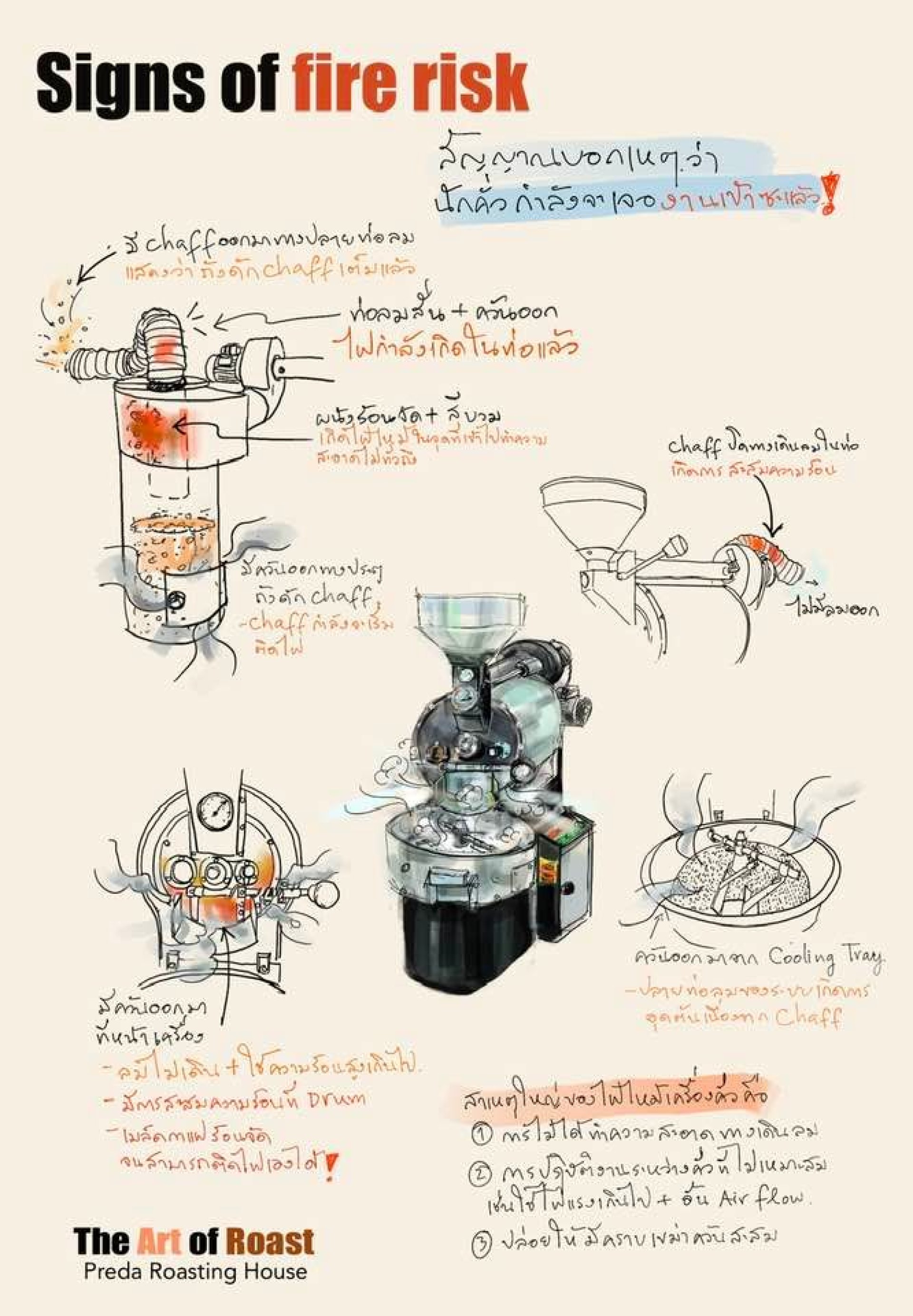 ไฟไหม้จากงานคั่วกาแฟนี่เขม่าควันจะดำและเหม็นรุนแรง มันต่างจากควันที่เราเจอตอนคั่วปกติมากครับ หากสามารถหลีกเลี่ยงปัญหาได้ก็จะดีมากครับ หากเราคอยตรวจสอบและจัดการ cleaning ระบบลมอยู่เสมอก็จะไม่เป็นไรเลยครับ แต่ถ้าบางทีเผลอทำงานเพลินเกินไป ความรู้เกี่ยวกับการดูควันดูลม ก็จะพอช่วยได้เหมือนกันครับ