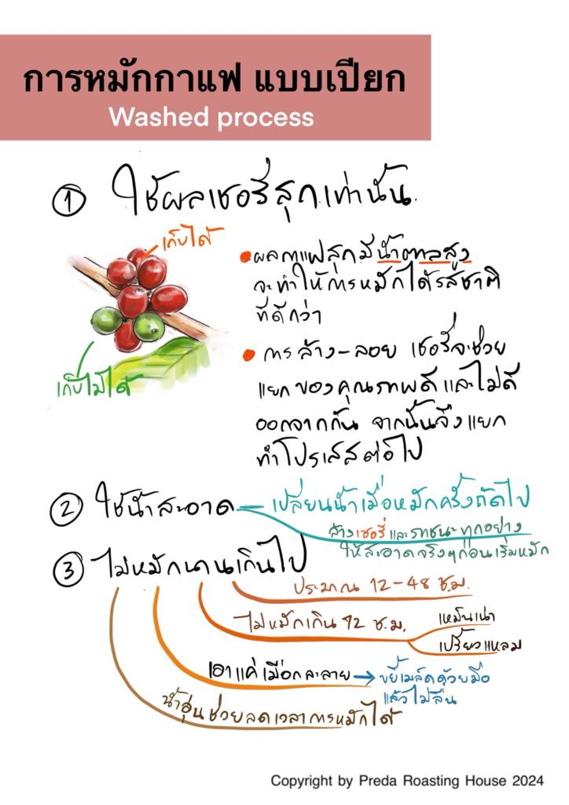 In the Washed Process, coffee cherries are depulped and the mucilage-covered beans are soaked in water for about 1224 hours.