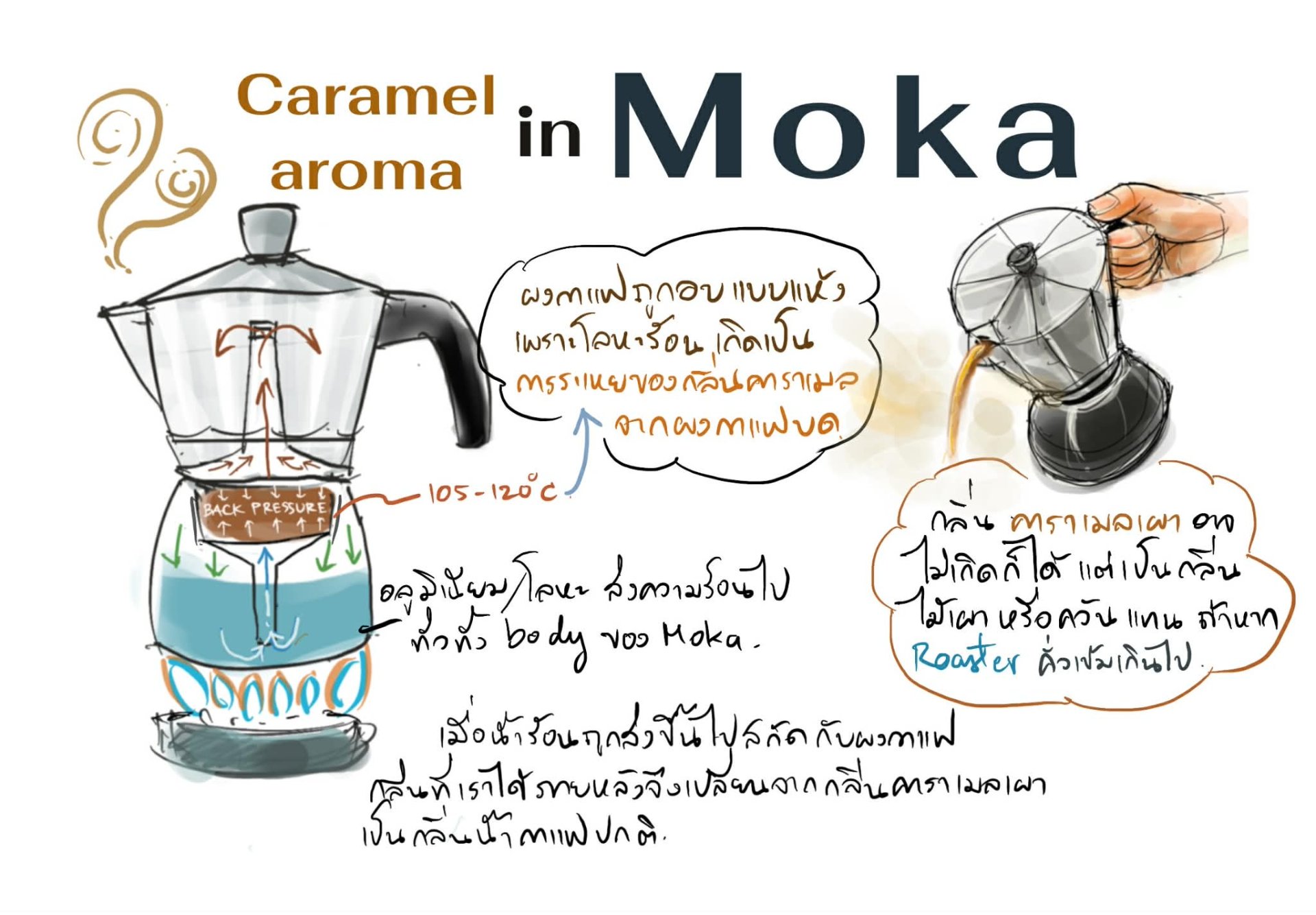 Summary: The burnt caramel scent in a Moka Pot is caused by coffee grounds being subjected to 105-120C heat before the water rises.