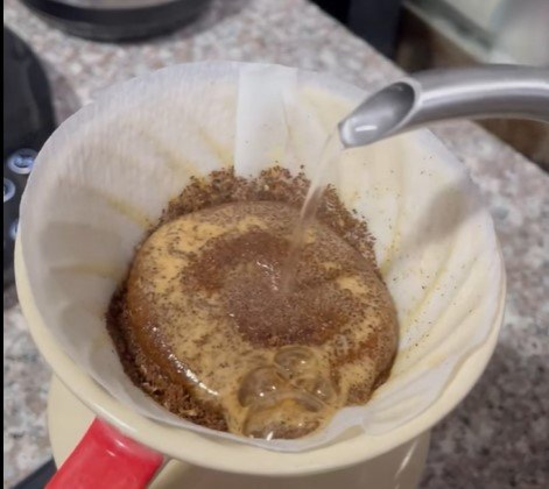 สังเกตุจังหวะดริปแรก (blooming) เกิดฟองขึ้นบุ๋งๆ เยอะ สันนิฐานว่าเพิ่งคั่วไม่เกิน 3 วัน แต่ถ้าดริปไปแล้ว ยืดเวลา blooming ขึ้นประมาณ 40 วินาที เพื่อให้น้ำซึมผ่านฟองแก๊สเข้าไปเปิดโพรงให้พร้อมสกัด กลับกัน หากกาแฟอายุเยอะไม่ค่อยเหลือแก๊สแล้ว การหด blooming ให้สั้นลงจะช่วยรสชาติสมูทขึ้นค่ะ