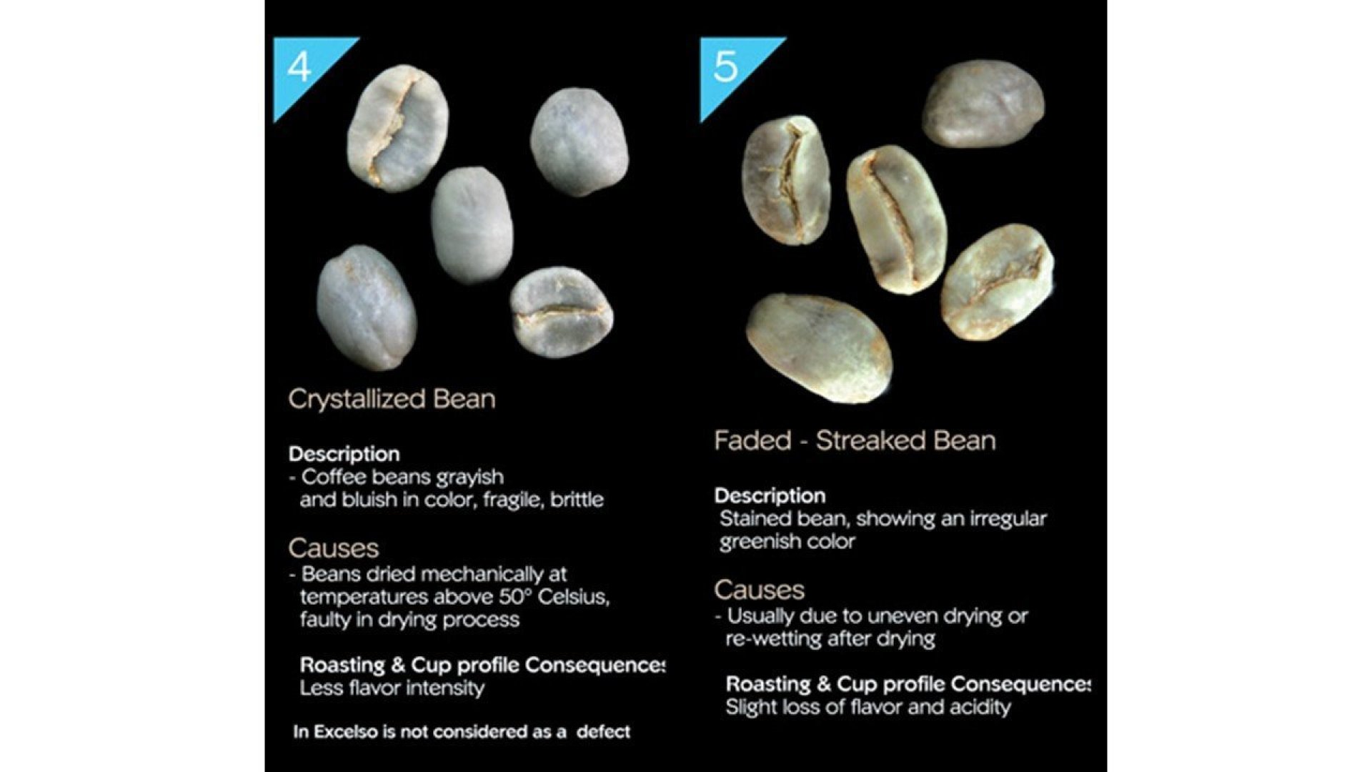 หากสังเกตทางกายภาพของเมล็ด Crystallized จะเห็นผิวด้านนอกดูเรียบออกเงาๆแต่เหมือนมีสีเขียวก่ำลึกๆอยู่ตรงเนื้อใน ซึ่งหมายถึงความชื้นที่ยังออกจากเมล็ดไม่หมดนั่นเอง เวลาดูของจากกาแฟล็อตพวกนี้เรามักจะเจอปัญหาอื่นประกอบกันด้วยครับ เช่นเมล็ดงอโค้ง (ความร้อนจัดทำให้โครงสร้างเซลล์กาแฟหดตัว) กะลาปริแตก centercut กว้าง
