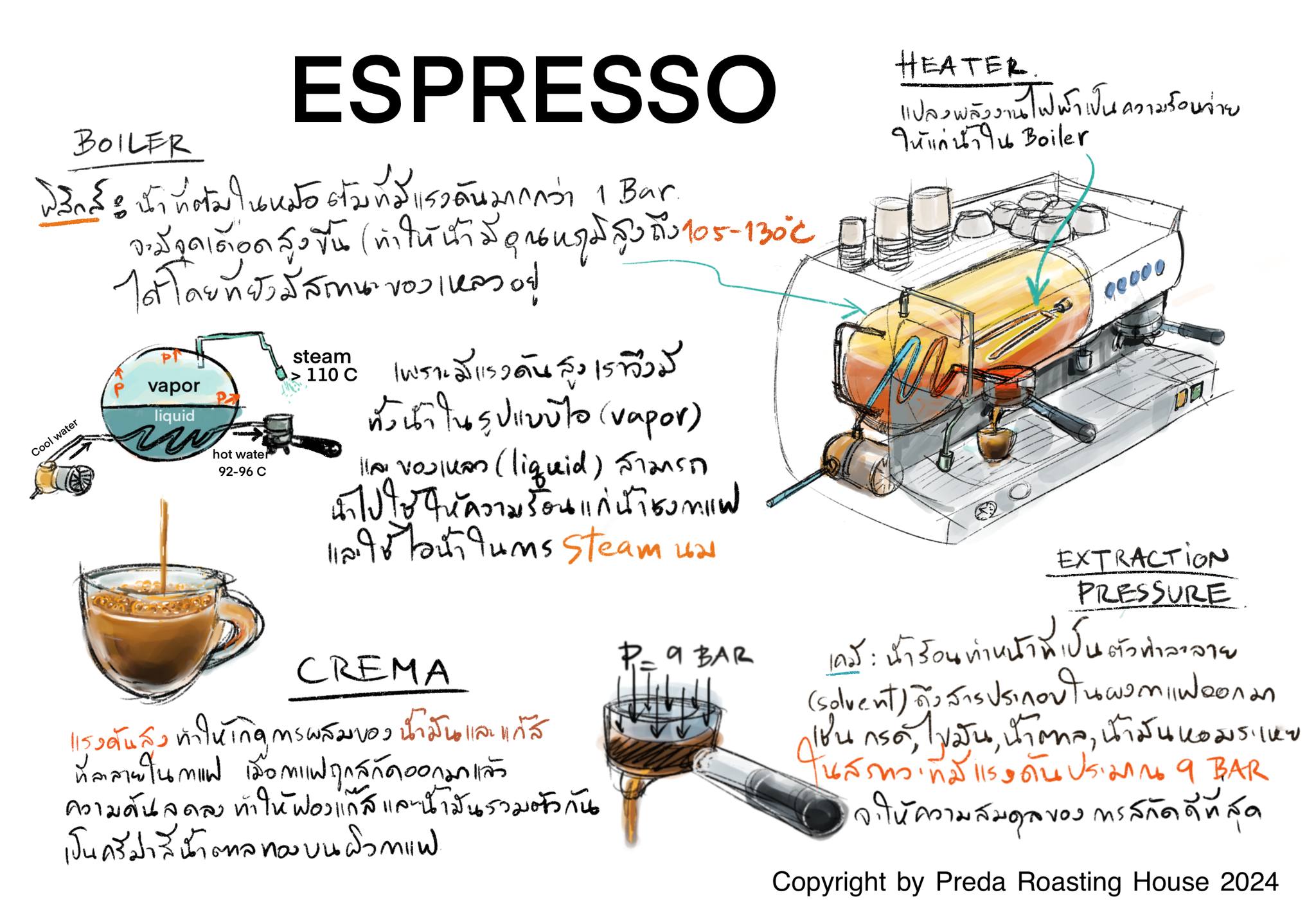 แรงดันสูงทำให้เกิดการผสมของน้ำมันและแก๊สที่ละลายในกาแฟ เมื่อกาแฟถูกสกัดออกมาแล้วความดันลดลง ทำให้ฟองแก๊สและน้ำมันรวมตัวกันเป็นครีม่าสีน้ำตาลทองบนผิวกาแฟ ซึ่งให้รสสัมผัสที่นุ่มนวลระหว่างดื่ม